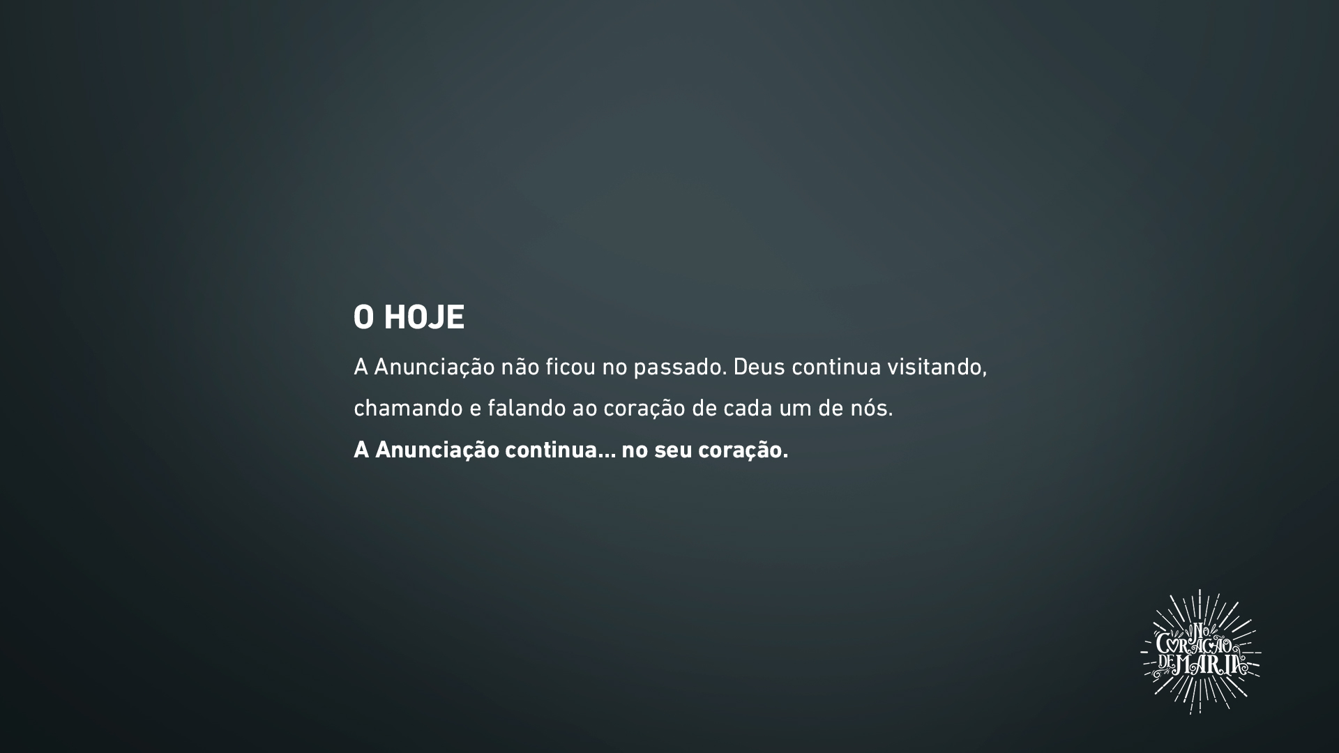 A Anunciação não é apenas um fato do passado. Ela continua acontecendo hoje. Deus continua visitando o coração de cada um de nós. Continua falando, muitas vezes no silêncio, muitas vezes em situações simples, muitas vezes de maneira inesperada. E Ele continua fazendo propostas: “Perdoa… recomeça… confia… entrega… segue por este caminho…” E, como Maria, muitas vezes nós também ficamos perturbados, inseguros, cheios de medo.